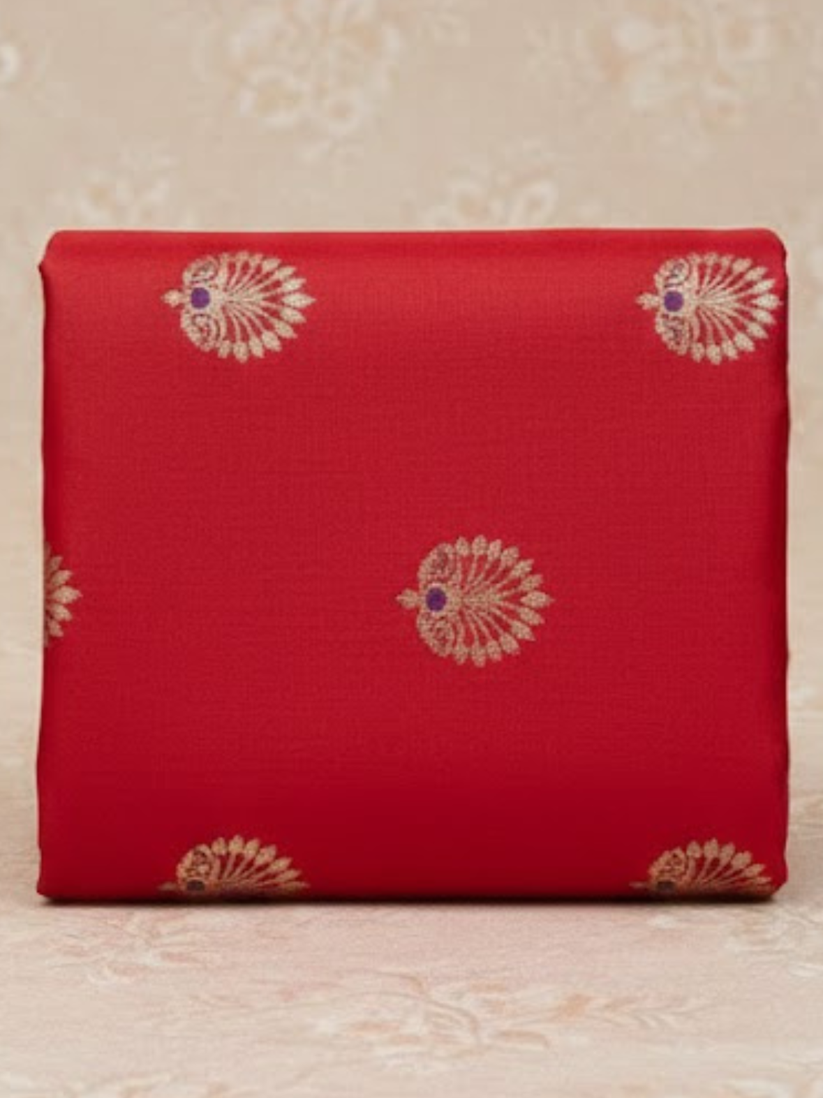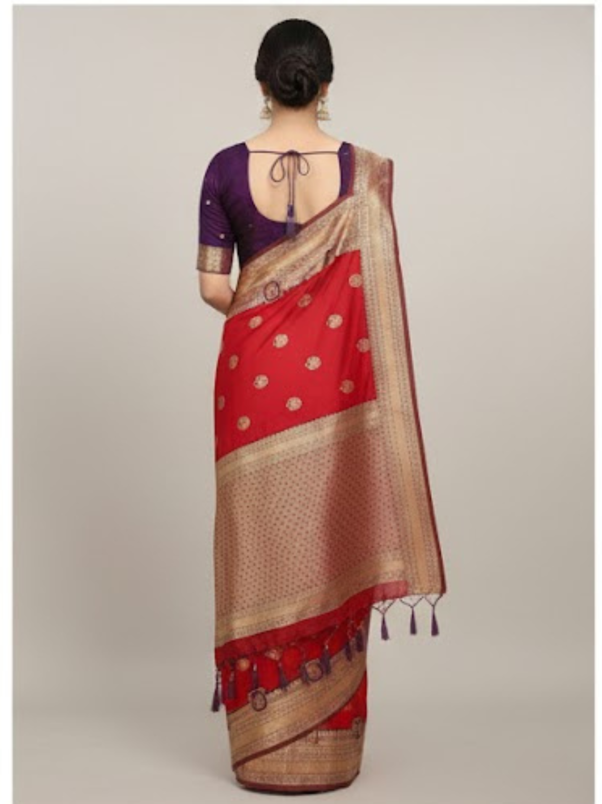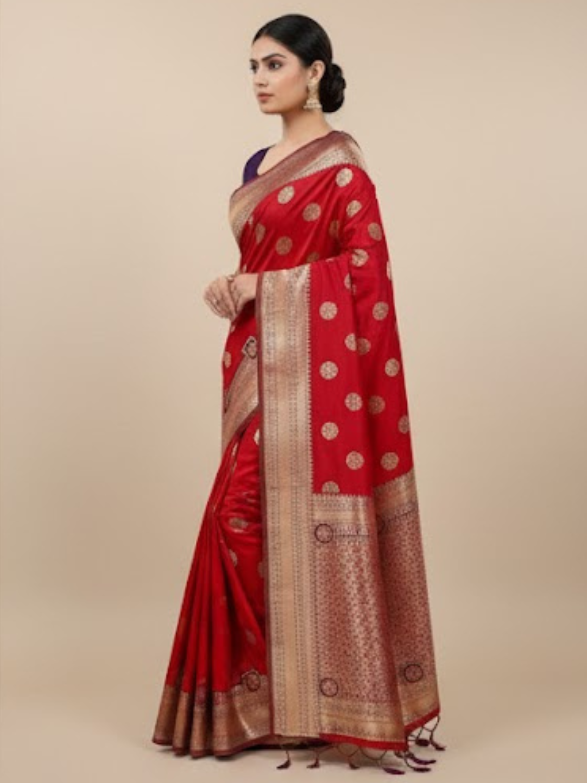 This saree features beautiful zari woven motifs all over the body along with a rich heavy border and intricately designed pallu with tassels, giving it a luxurious festive appeal. The vibrant red color symbolizes elegance and tradition, making it a perfect choice for weddings, festivals, and celebrations.