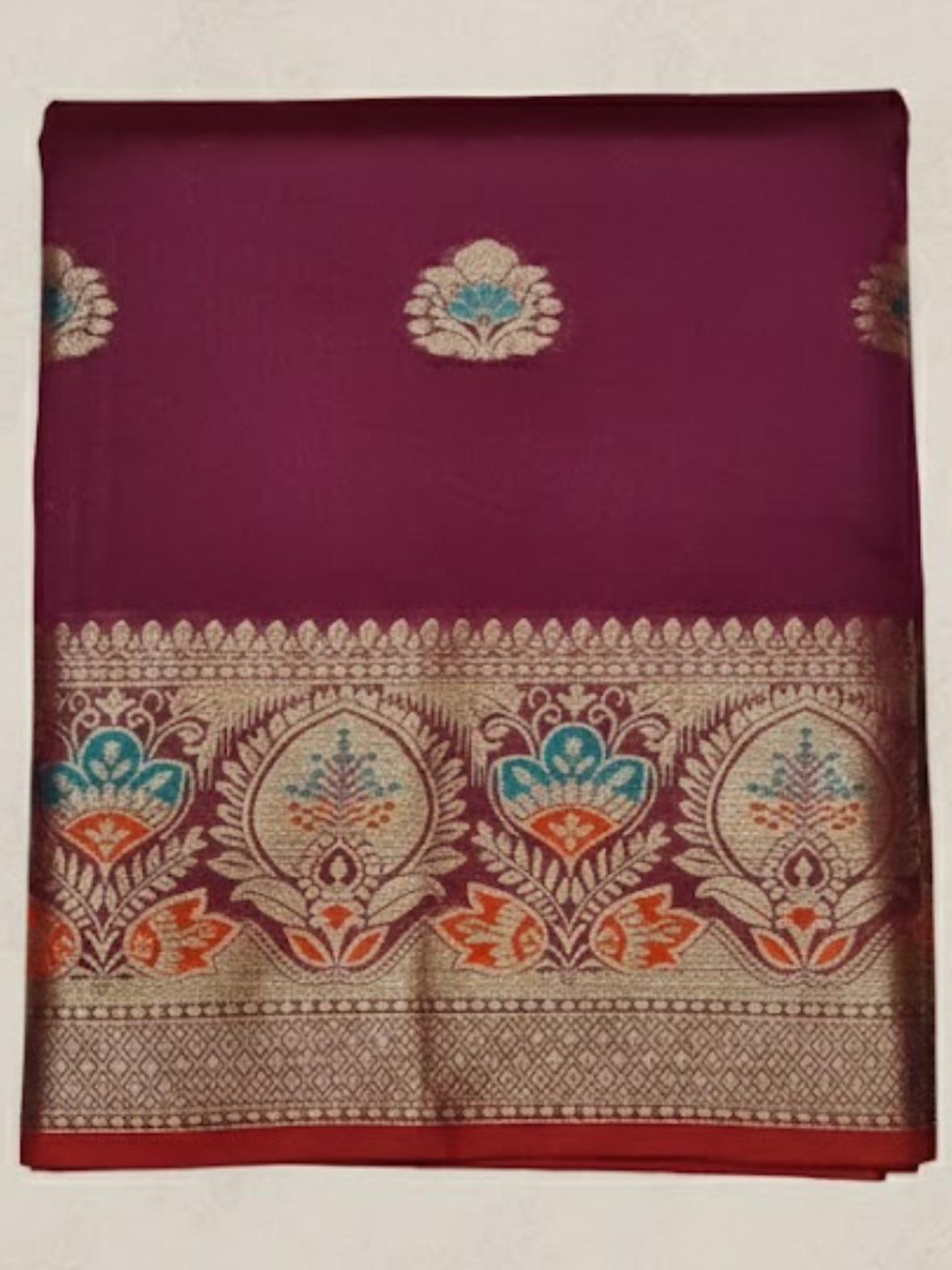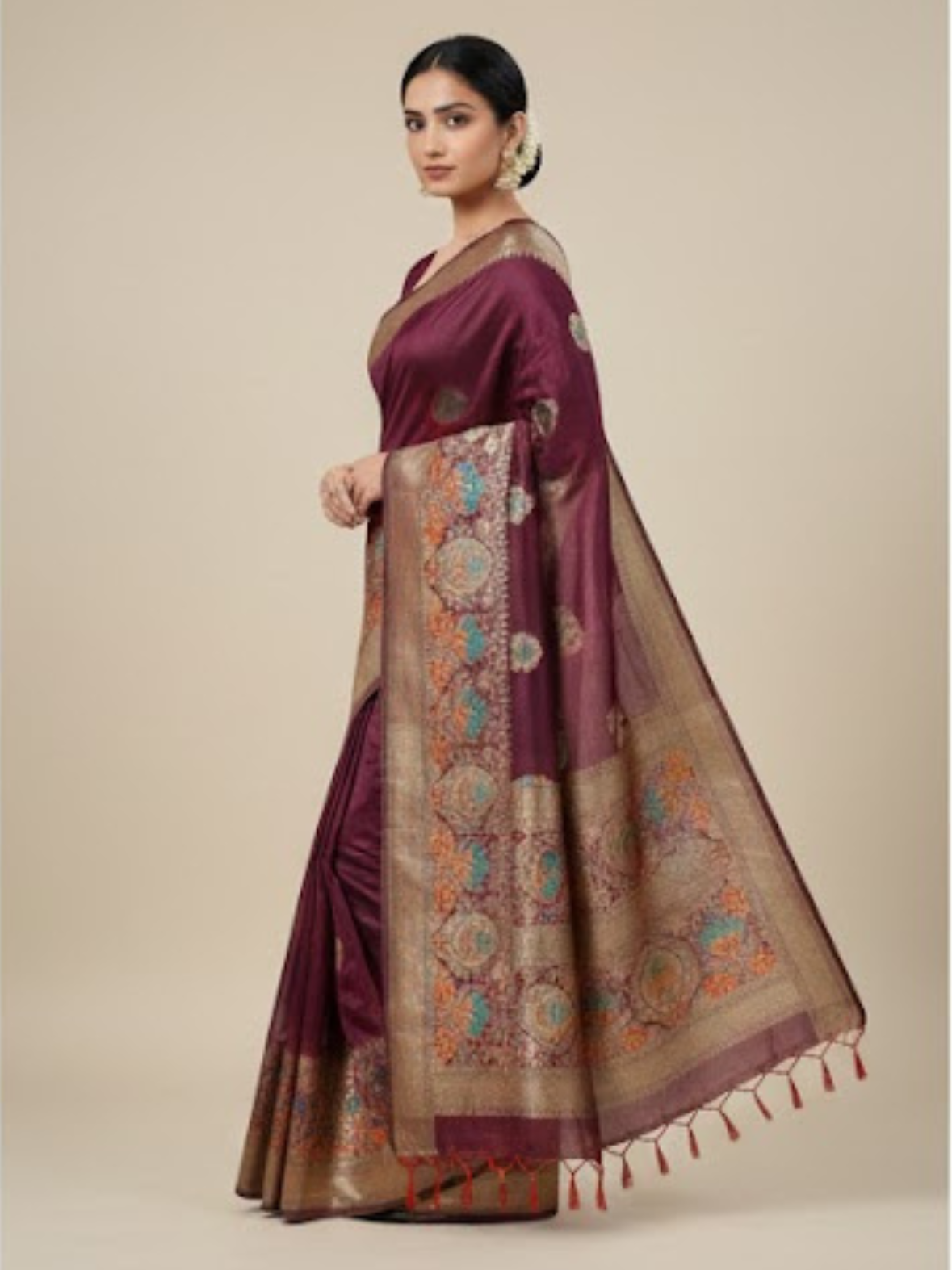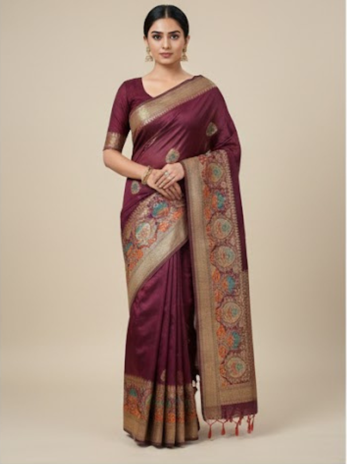 Make a statement of timeless elegance with this wine maroon Art Silk saree from Usha Garments. Designed with a rich ethnic appeal, this saree features a deep maroon base beautifully highlighted with subtle multicolor traditional motifs, paired with a luxurious zari-style border and intricately designed pallu.